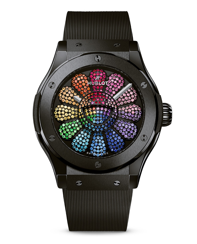 Classic Fusion Takashi Murakami in 45 mm black ceramic case with microblasted rhodium-plated dial and 384 colored gemstones, 50,000 Swiss francs ($57,611); Hublot