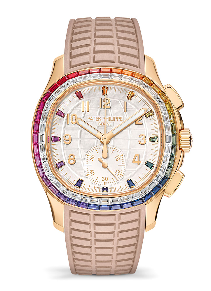 Aquanaut Luce Rainbow Chronograph Ref. 7968/300R-001 in 18k rose gold with diamond and sapphire bezel, $212,904; Patek Philippe