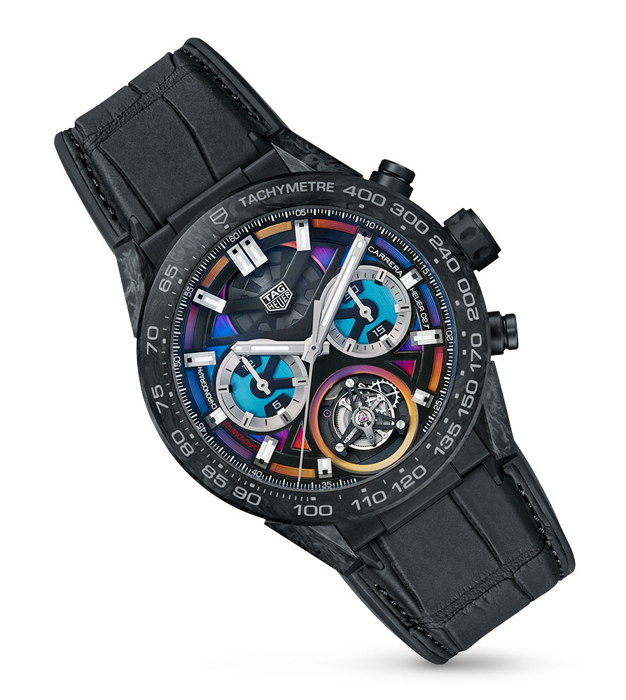 Carrera Chronograph Tourbillon Polychrome in 45 mm black PVD titanium case with rainbow-colored skeleton dial, $24,050; TAG Heuer