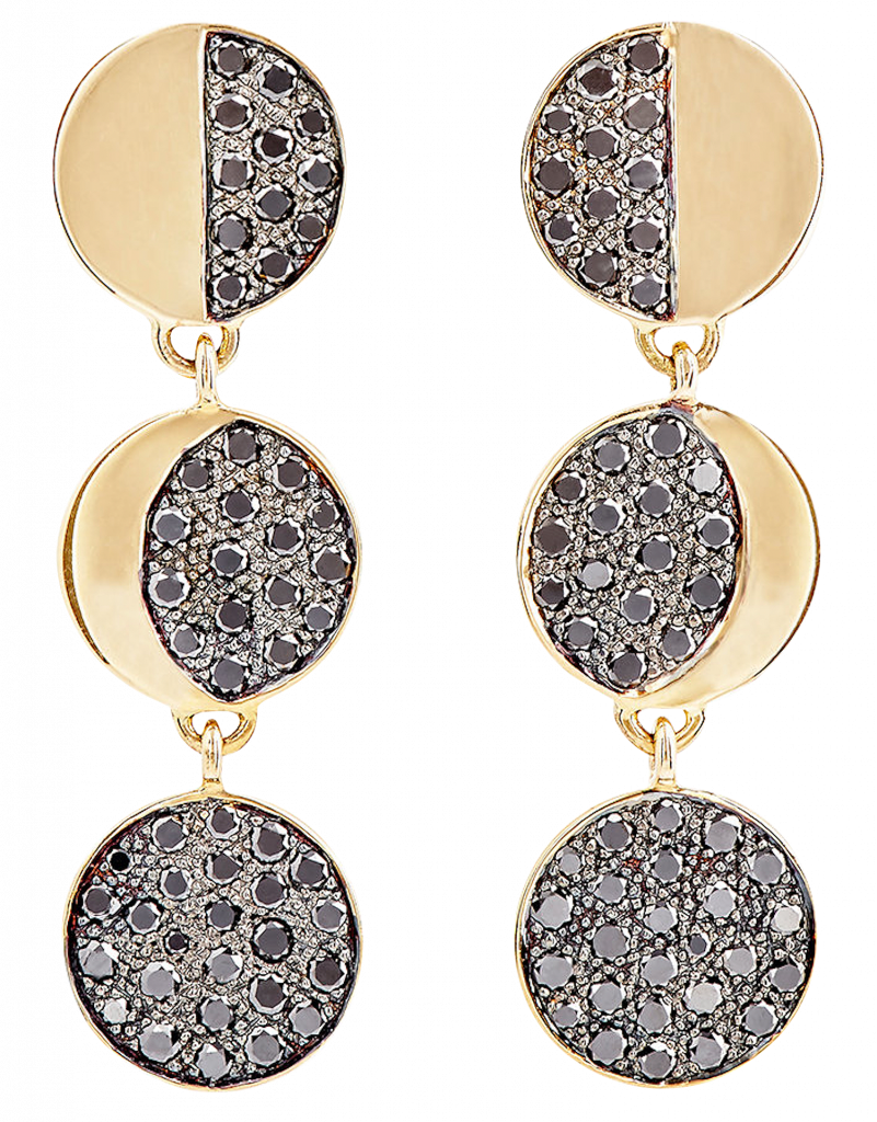 Moon Phase drop earrings with black diamonds in 18k yellow gold; $4,000; Pamela Love; sales@pamelalove.com; pamelalove.com
