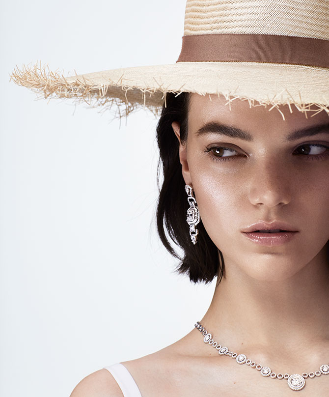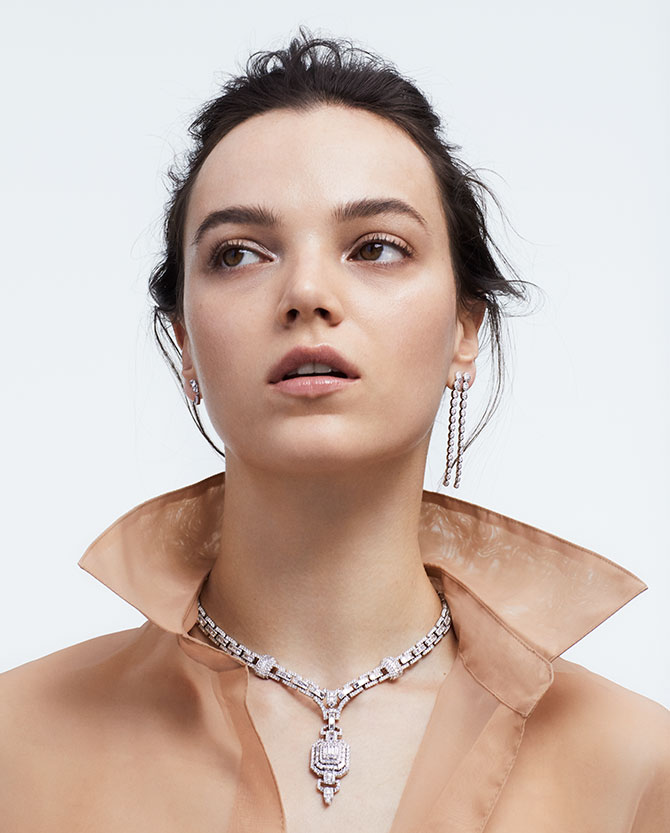 18k white gold necklace with 9.55 cts. t.w. diamonds, $185,000, Uneek, 213-622-5119, uneekjewelry.com; Heirloom collection Art Deco earrings in 18k gold with 5.4 cts. t.w. diamonds, $14,950, Ashi Diamonds, 800-622-2744, ashidiamonds.com