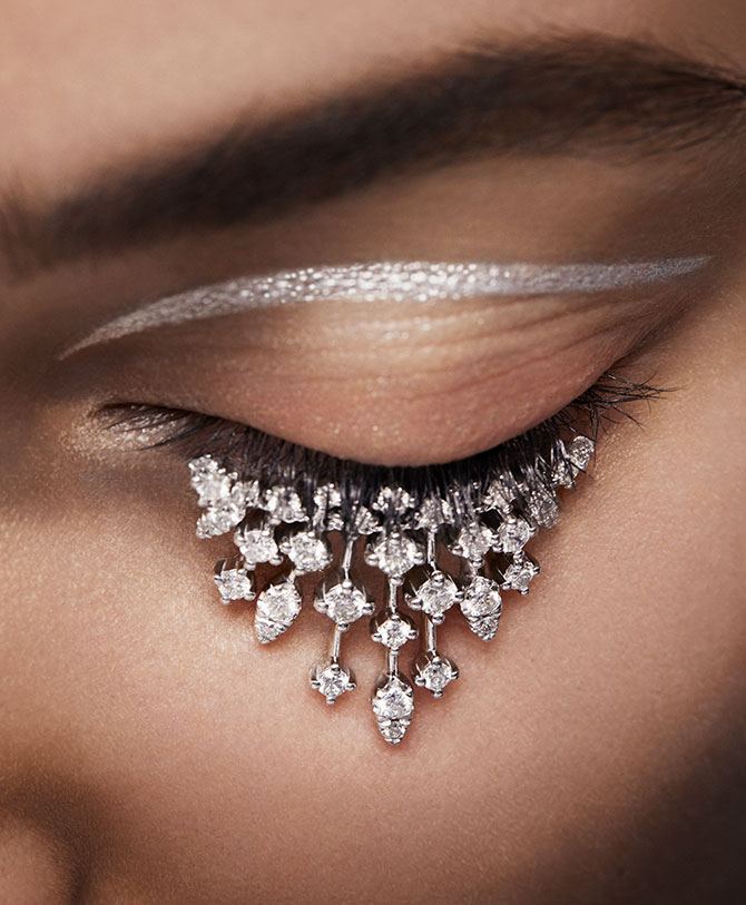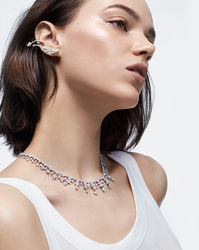 18k white gold necklace with 20.04 cts. t.w. diamonds, $100,000, Jye’s International, 415-621-8880, jyescorp.com; 18k white gold ear climber with 0.88 ct. t.w. round and 1 ct. t.w. pear-shape diamonds, $8,000 (sold as pair), Michael John Jewelry, 949-387-6777, michaeljohnjewelry.com; Kaslique 14k white gold drop earrings with 1.19 cts. t.w. diamonds, $1,919 (sold as pair), Gabriel & Co., 212-519-1400, gabrielny.com