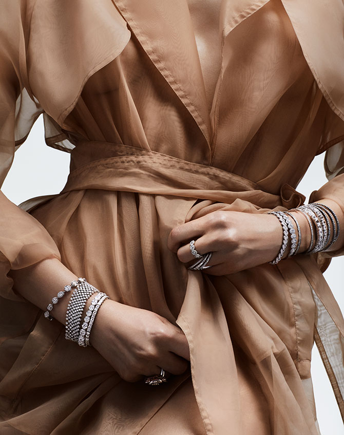 18k white gold bar bracelet with 7.92 cts. t.w. mixed-shape diamonds, $60,000, 18k white gold bangle with 11.89 cts. t.w. emerald-cut diamonds, $136,960, Rahaminov Diamonds, 213-622-9866, rahaminov.com; 14k white gold bracelets with 2.61–2.75 cts. t.w. diamonds, $6,900–$8,000, 18k white gold bracelet with 13.5 cts. t.w. diamonds, $36,250, Beny Sofer, 800-30-SOFER, benysofer.com; East-West platinum bracelets with 9.7–21 cts. t.w. oval- and emerald-cut diamonds, $25,000–$200,000, Norman Silverman, 213-687-3985, normansilverman.com; platinum ring with 0.26 ct. t.w. diamonds and 3.8 cts. t.w. baguette diamonds, $24,600, Jye’s International, 415-621-8880, jyescorp.com; Slinkie bracelet in 14k gold with 4.1 cts. t.w. diamonds, $10,975, KC Designs, 212-921-9270, kcdesignsnyc.com; 14k white gold ring with 2.28 cts. t.w. diamonds, $7,900, 14k white gold bracelet with 4.97 cts. t.w. diamonds, $18,800, Shy Creation, 213-623-8900, shycreation.com; 14k white gold Kaslique band with 1.61 cts. t.w. diamonds, $4,685, Gabriel & Co., 212-519-1400, gabrielny.com