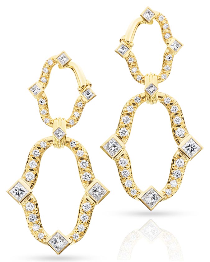 Secret Garden earrings in 18k yellow gold with 0.76 ct. t.w. round and 1.13 cts. t.w. princess diamonds; $9,000; Gumuchian; 212-593-9888; gumuchian.com
