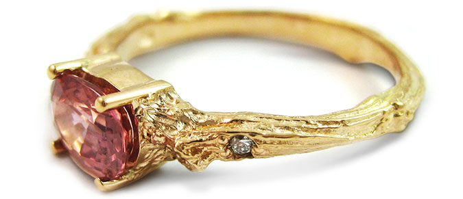 Twig ring in 18k yellow gold with 1.06 ct. padparadscha sapphire and 0.08 ct. t.w. diamonds; $4,340K. Brunini Jewels; 858-259-8779; kbrunini.com