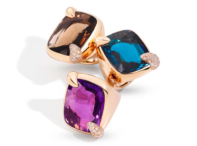 Ritratto rings with smoky quartz, London blue topaz, and amethyst and diamonds in 18k rose gold; $9,600–$12,100; Pomellato; 800-254-6020; pomellato.com