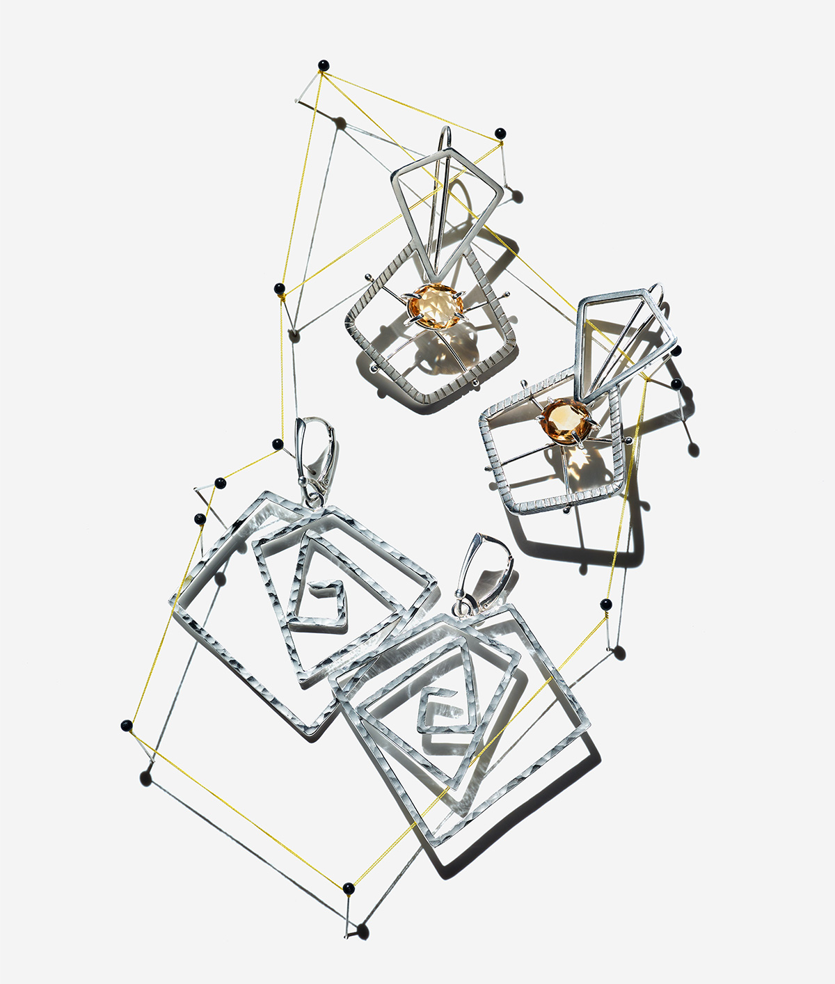 Decodas sterling silver earrings with 4 cts. t.w. Brazilian citrine, $600; Atomic Roses sterling silver earrings, $225; Amy C. Pyles; 610-390-5835; amycpyles.com