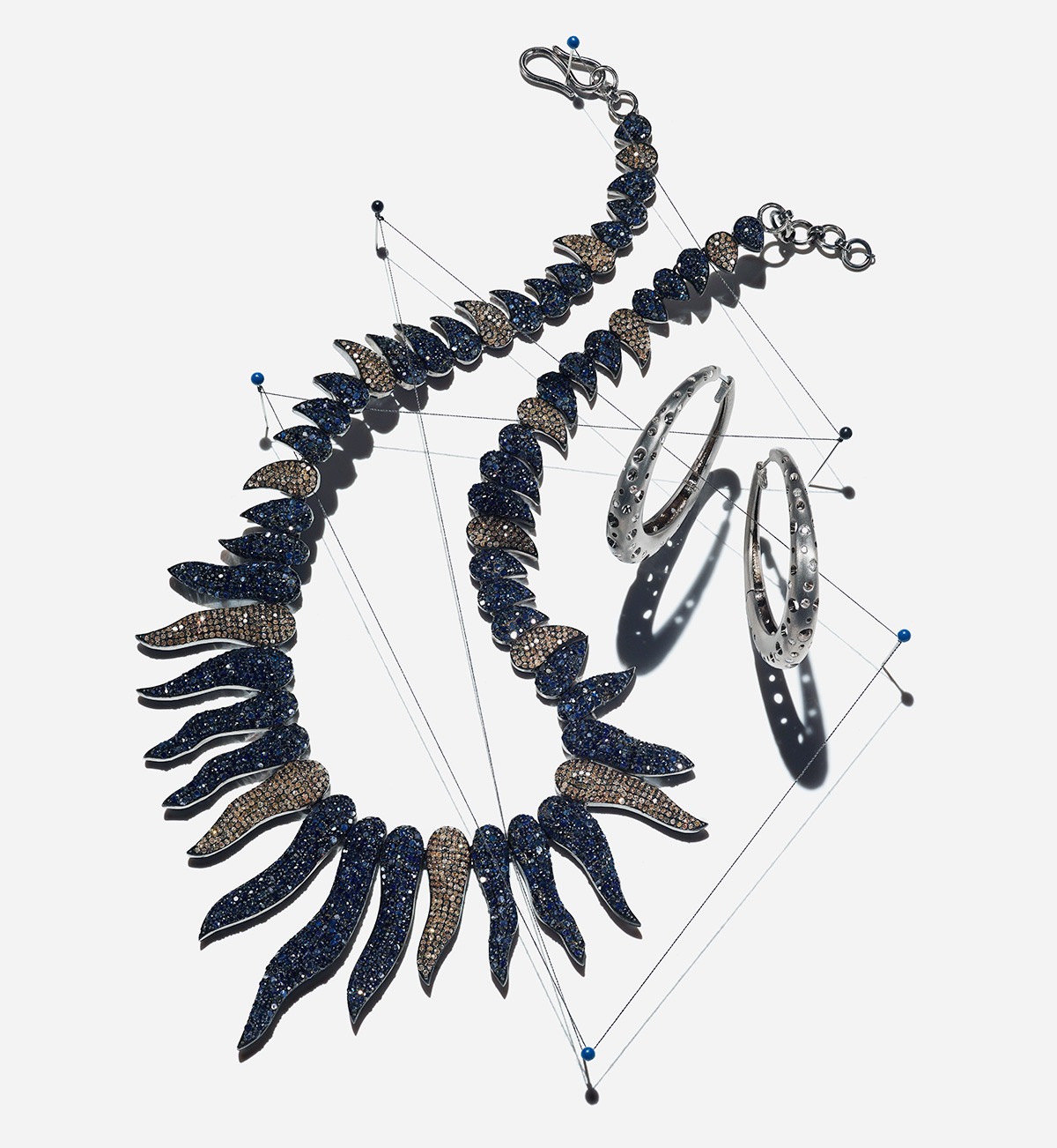 Venah necklace in rhodium-plated sterling silver with 24.06 cts. t.w. sapphires and 5.03 cts. t.w. diamonds, $5,500, Modern Moghul, 361-239-8799, modernmoghul.com; oversize Oculus click black rhodium–plated sterling silver earrings with 0.37 ct. t.w. diamonds and 18k gold hinge and posts, $2,800, Dana Bronfman, 650-269-1101, danabronfman.com