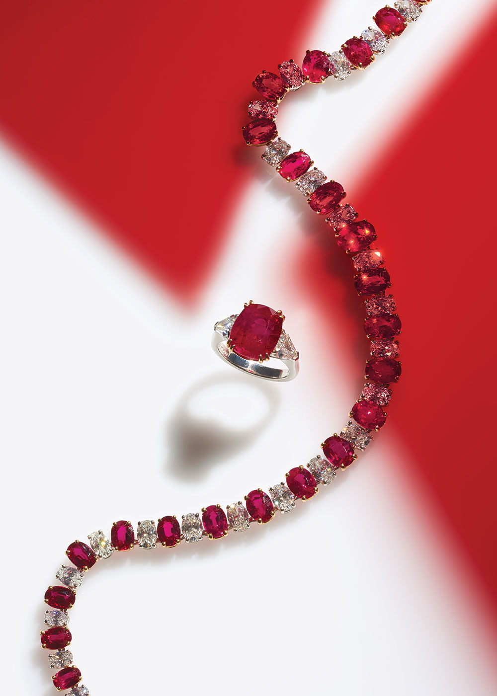 Ring in platinum with a Burmese ruby and diamonds, price on request, Jack Abraham, NYC, 212-688-6700, jackabraham.com; necklace in platinum and 18k gold with Burmese rubies and diamonds, price on request, Oscar Heyman, NYC, 212-593-0400, oscarheyman.com