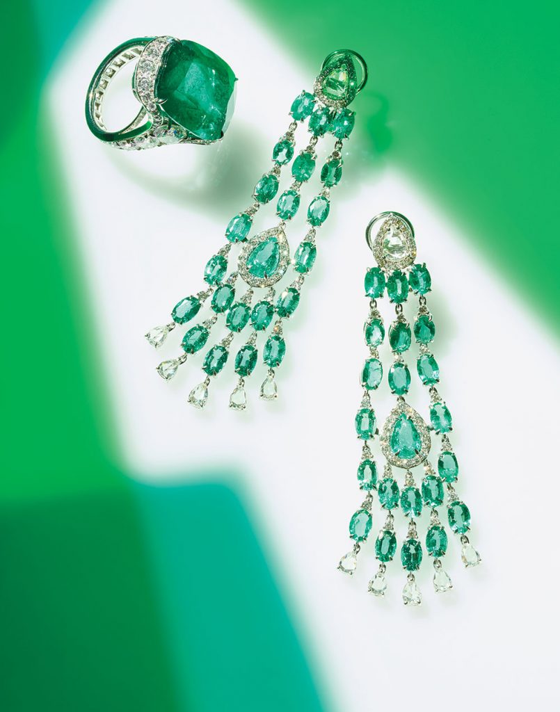 Ring in platinum with a cushion-cut Colombian emerald and diamonds, price on request, Robert Procop, Beverly Hills, Calif., 310-276-6041, robertprocop.com; earrings in 18k gold with emeralds and diamonds, $56,500, Sutra, Houston, 713-984-4987, sutrajewels.com