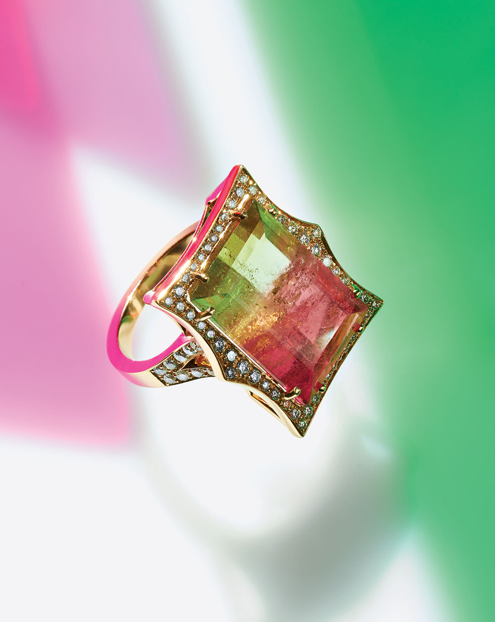 Ring in 18k gold with a bicolor tourmaline and diamonds; $8,448; Lauren K, NYC; 212-719-2067; laurenk.com