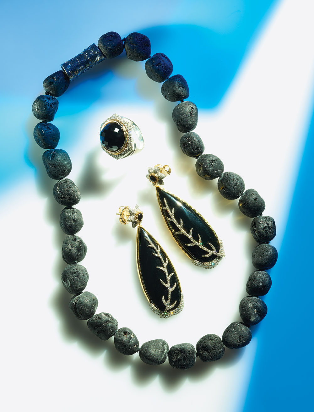Earrings in 18k and 24k gold with black jade and diamonds, $27,280, Victor Velyan, Los Angeles, 213-955-5950, victorvelyan.com; ring in sterling silver and 18k gold with black spinel and diamonds, $3,300, Gigi Ferranti, NYC, 718-251-1614, gigiferrantijewelry.com; pebble strand with black tourmaline, silver, and diamonds, $3,650, Elizabeth Garvin Fine Jewelry, NYC, 212-420-9470, elizabethgarvin.com