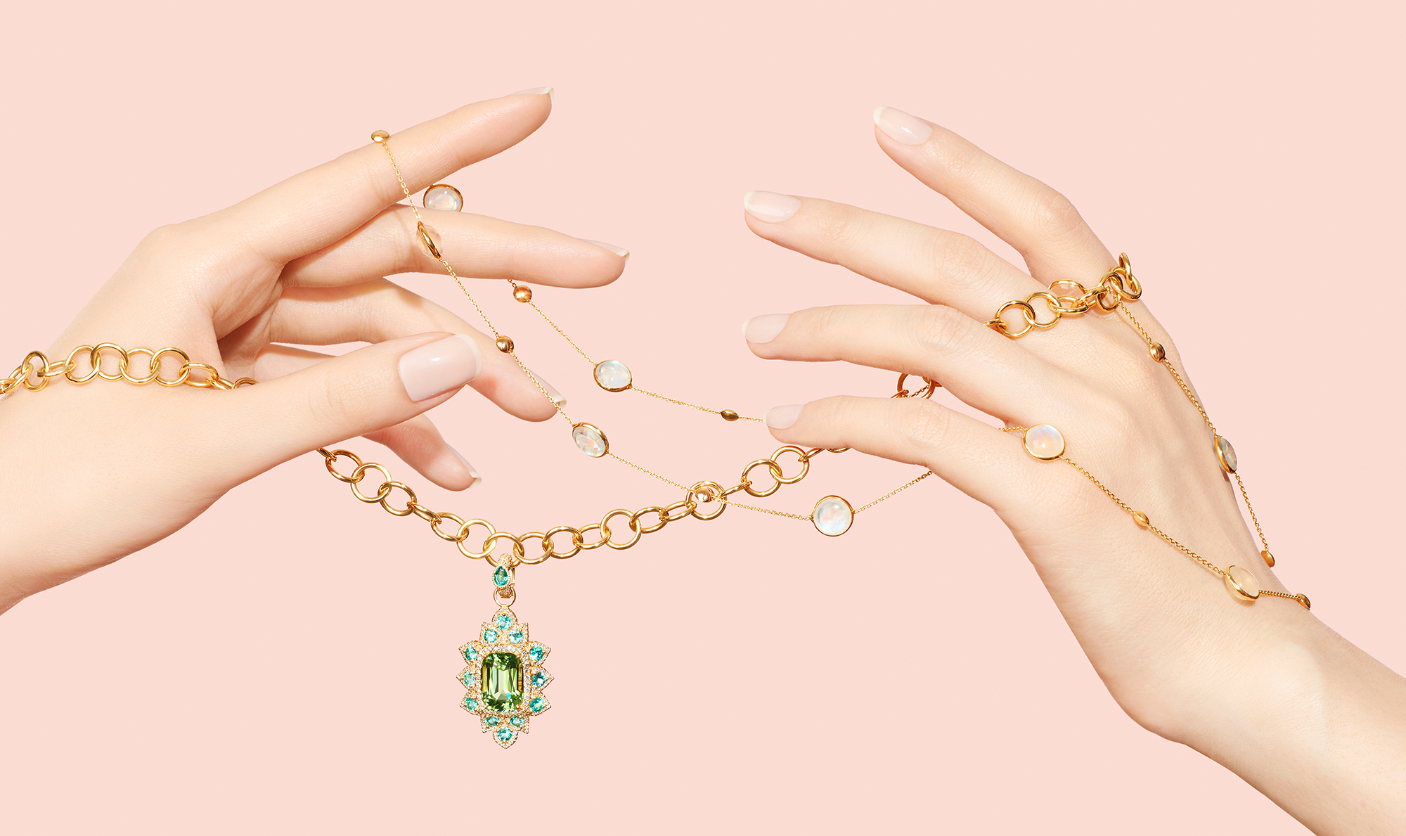 Rainbow moonstone long station necklace in 18k yellow gold, $2,375, Trésor Collection, info@tresorcollection.com, tresorcollection.com; 18k yellow gold Etoile pendant with 7.71 ct. Mozambique paraiba tourmaline, 2.09 cts. t.w. Brazilian Paraiba tourmaline accents, and 0.7 ct. t.w. diamonds, $93,000, handmade Super Cool chain in 18k yellow gold, $15,000, Erica Courtney, 323-938-2373, ericacourtney.com