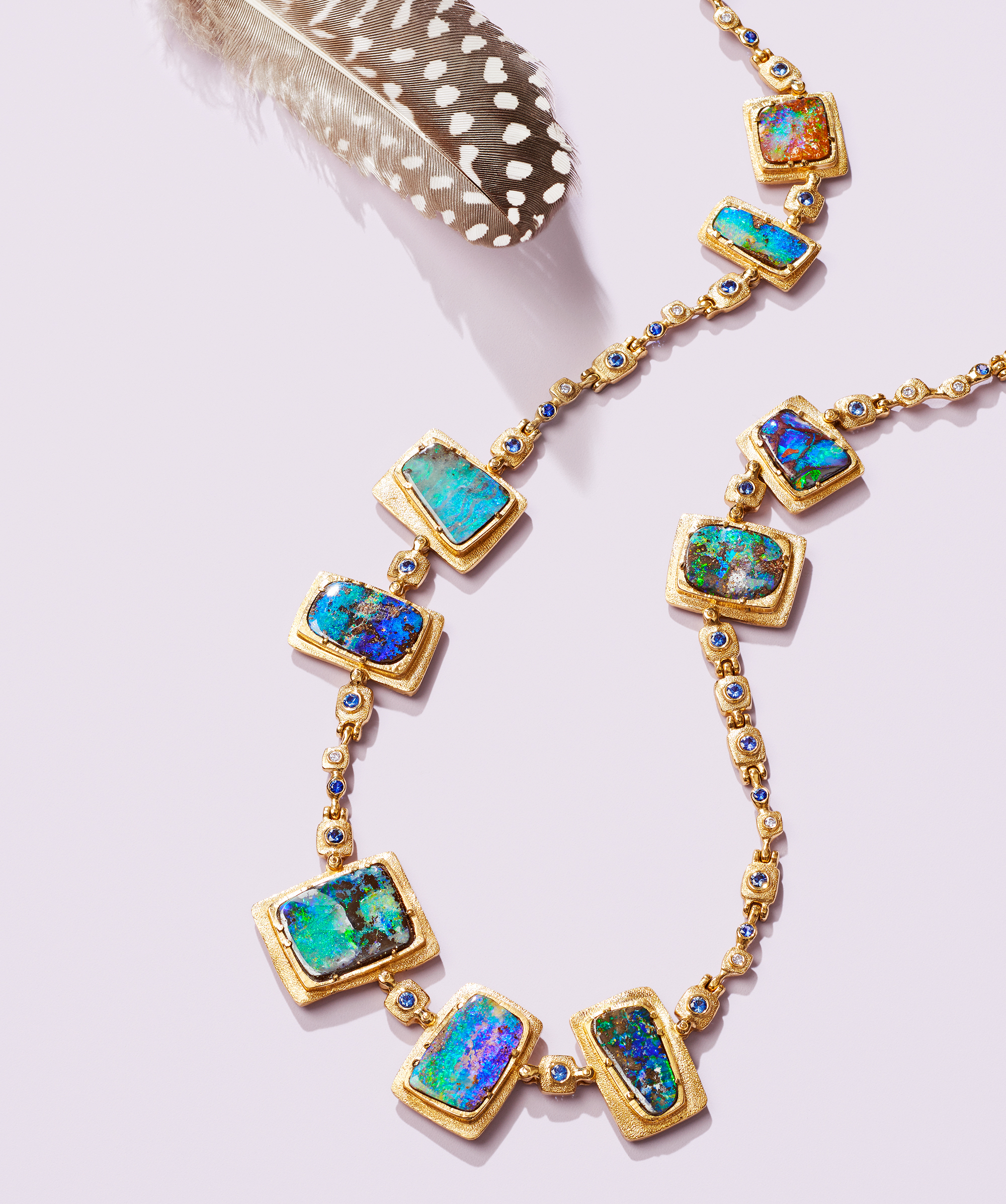 Skyline necklace in 18k yellow gold with 35 cts. t.w. boulder opals, 1.35 cts. t.w. blue sapphires, and 0.36 ct. t.w. white diamonds; $11,700; Audrius Krulis; info@audriuskrulis.com; audriuskrulis.com