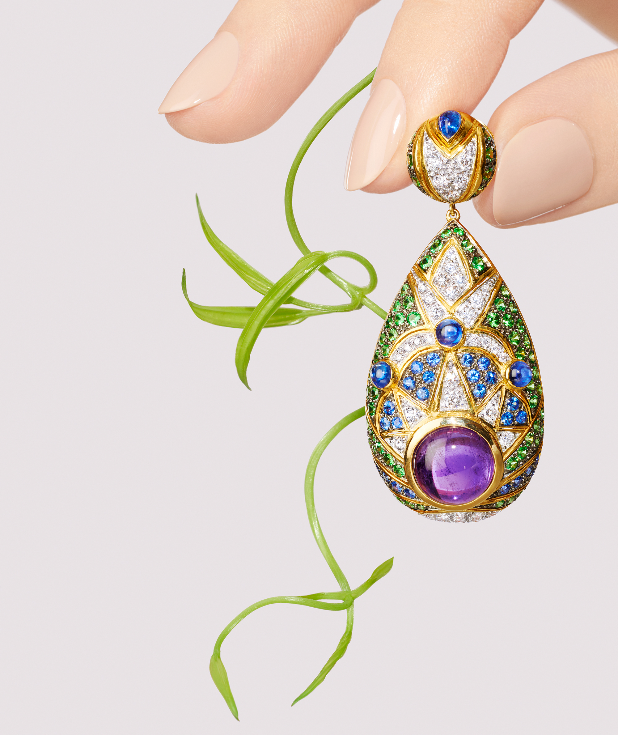 Space Blossom earrings with amethyst, tsavorite, blue sapphire, and diamonds in 18k yellow gold; $14,920; M. Spalten; mspalten@gmail.com; mspalten.com