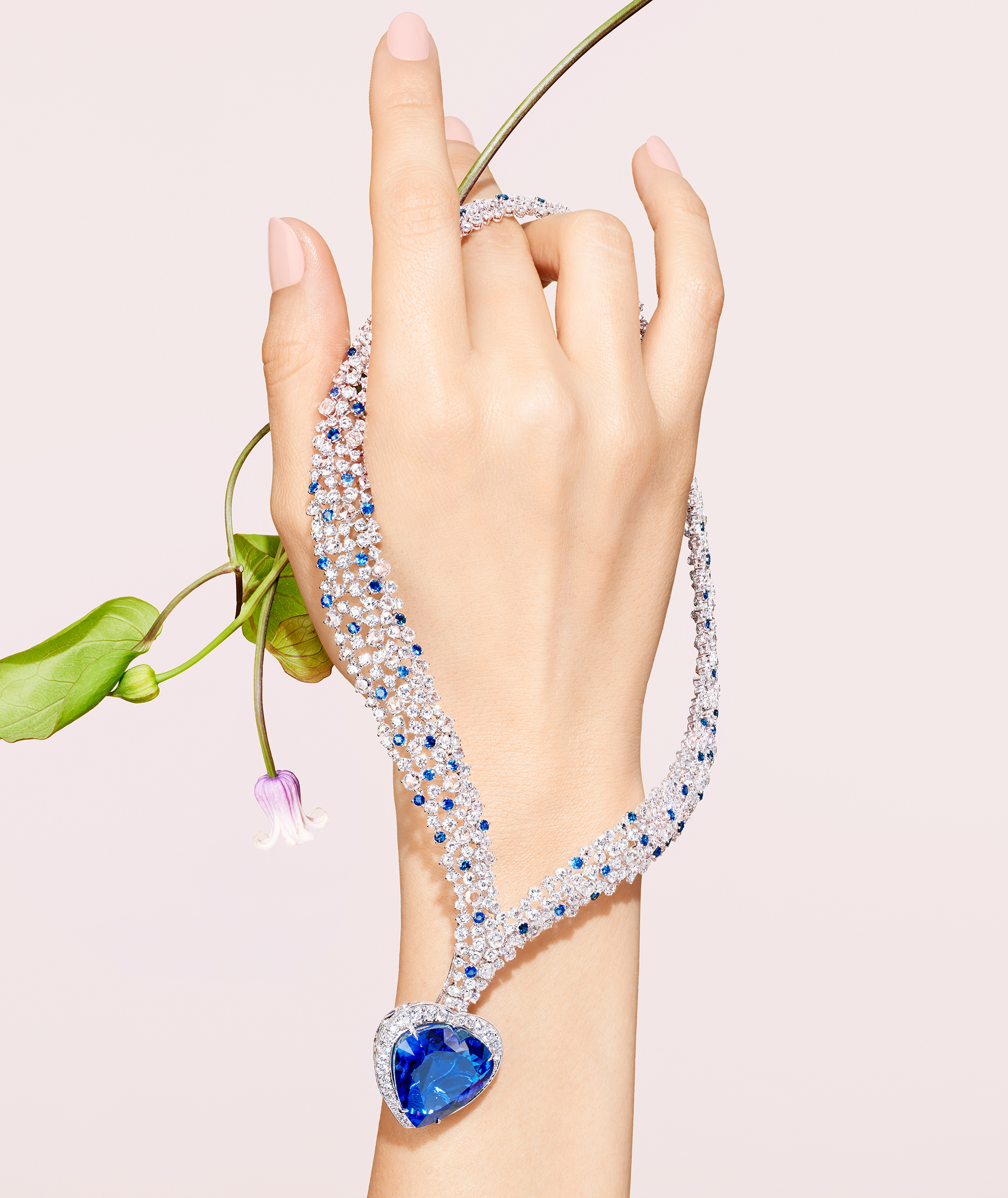 Collar necklace in 18k gold with 6.1 cts. t.w. blue sapphires, 32.1 cts. t.w. diamonds, and 45.22 ct. heart-shape tanzanite; price on request; Nigaam; sales@nigaam.com; nigaam.com