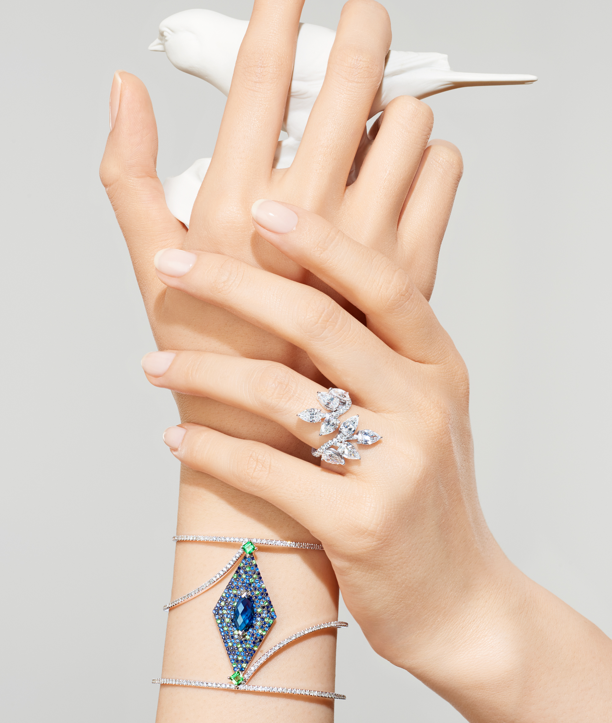 Linee Misteriose cuff in 18k white gold with 2.4 ct. London blue topaz, 2.4 cts. t.w. icy diamonds, 1.1 cts. t.w. sapphires, 0.8 ct. t.w. tsavorite, and 0.35 ct. t.w. diamonds, $13,600, Dionea Orcini for Plukka, 212-382-3018, plukka.com; 18k white gold branch bypass ring with 4.1 cts. t.w. diamonds, $35,000, Rahaminov Diamonds, 800-742-8864, rahaminov.com