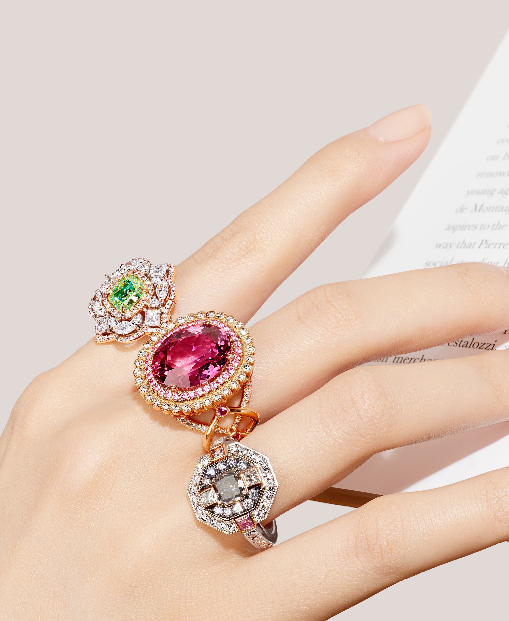 18k white and rose gold ring with a 2.01 ct. natural fancy light yellow-green diamond, 2.08 cts. t.w. white diamonds, and 0.65 ct. t.w. pink pavé diamonds, $77,586, Cirari, info@cirari.com, cirari.com; 18k rose gold Lila ring with a 13 ct. malaya Mahenge garnet, pink sapphires, and diamonds, $57,600, Erica Courtney, 323-938-2373, ericacourtney.com; platinum and 18k gold ring with 1.11 ct. natural fancy dark violetish-gray radiant shape diamond, 0.25 ct. t.w. natural intense purplish-pink princess-shape Argyle diamonds, 0.28 ct. t.w. princess-shape white diamonds, and 1.29 cts. t.w. natural blue and white melee, $211,400, Scott West for L.J. West Diamonds, 212-997-0940, ljwestdiamonds.com