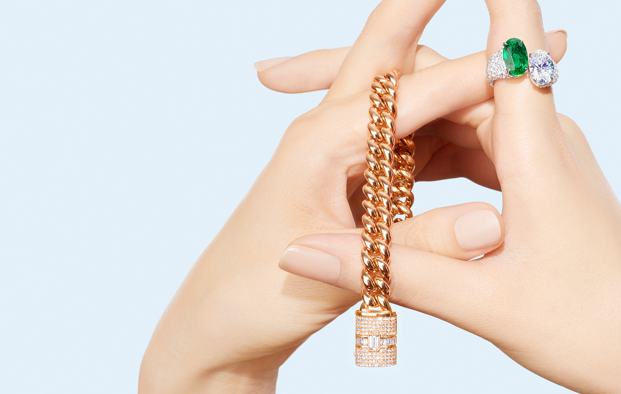 Link bracelet with mixed diamond clasp, $13,440, Shay, 424-777-0210, shayfinejewelry.com; ring in 18k gold with 3.01 ct. oval-cut diamond and 3.64 ct. oval emerald with 1.78 cts. t.w. pavé diamonds, price on request, Nigaam, sales@nigaam.com, nigaam.com