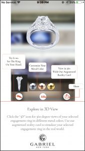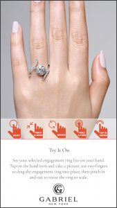 The Gabriel Magic App is an augmented-reality tool that allows for customization plus a 360-degree view that lets the customer see exactly how a piece will look on her hand. Video links enable her to share Gabriel & Co.’s computerized three-dimensional view of the custom item with friends and family—and to have it on hand (literally and figuratively) while finalizing her order.